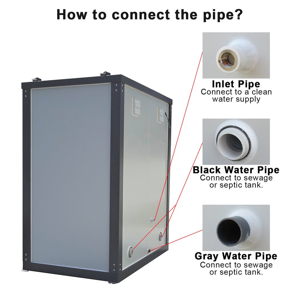 Pokud se tyto soukromé mobilní toalety Bastone 2 používají na staveništi, doporučujeme připojit toalety k kanalizačnímu systému a napojit přívod vody na vodovodní síť. V opačném případě budete možná potřebovat kontejnery na odpad mimo staveniště.