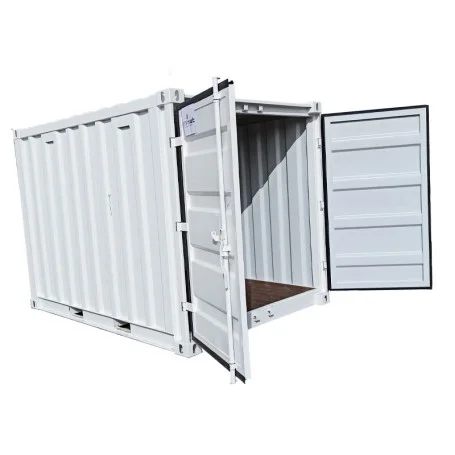 Náš 10stopý skladovací kontejner má kompletně svařovaný rám z 3 mm silných ocelových profilů. Stěny a strop jsou vyrobeny z 1,5 mm silného válcovaného plechu a podlaha z 25 mm silného masivního dřeva, které je ošetřeno proti vlhkosti. Je vybaven ochrannou klapkou pro visací zámek.