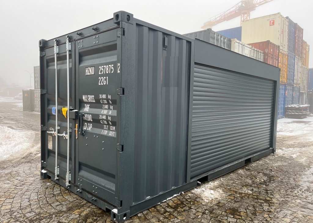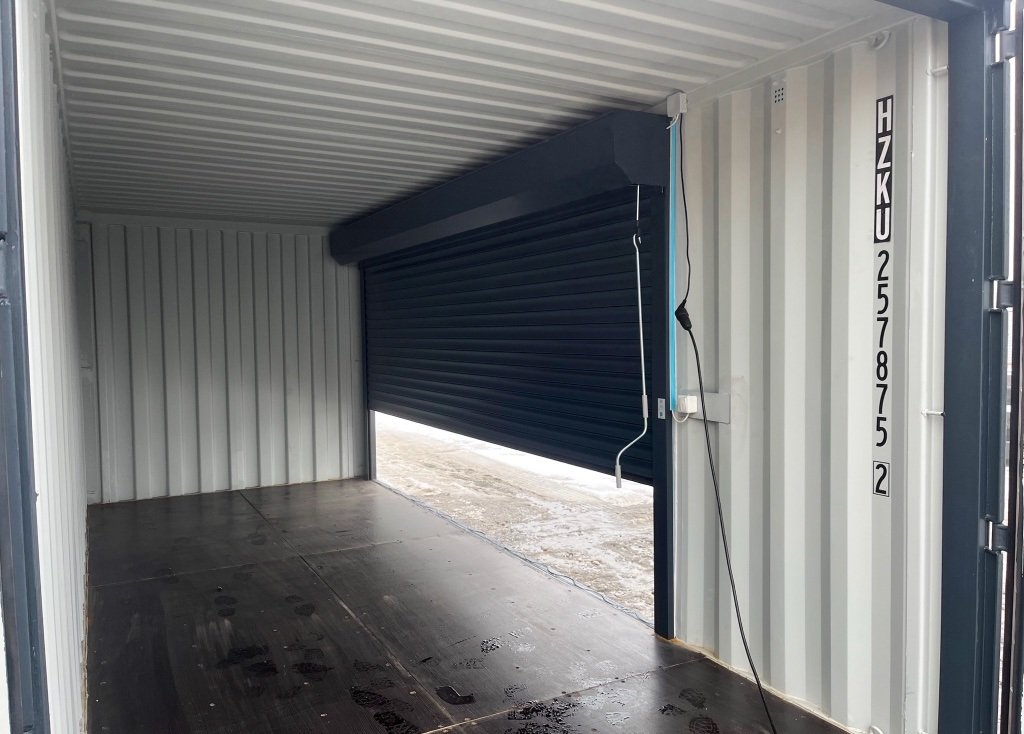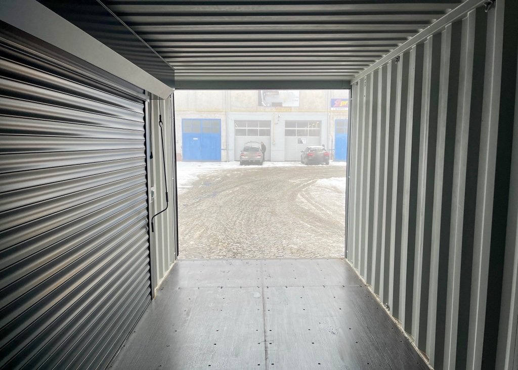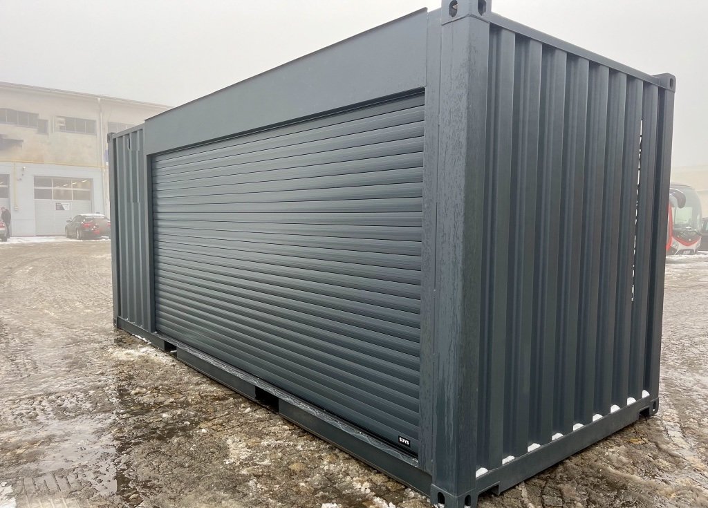 Kontejner s úpravami – roletová vrata a vstupní dveře.